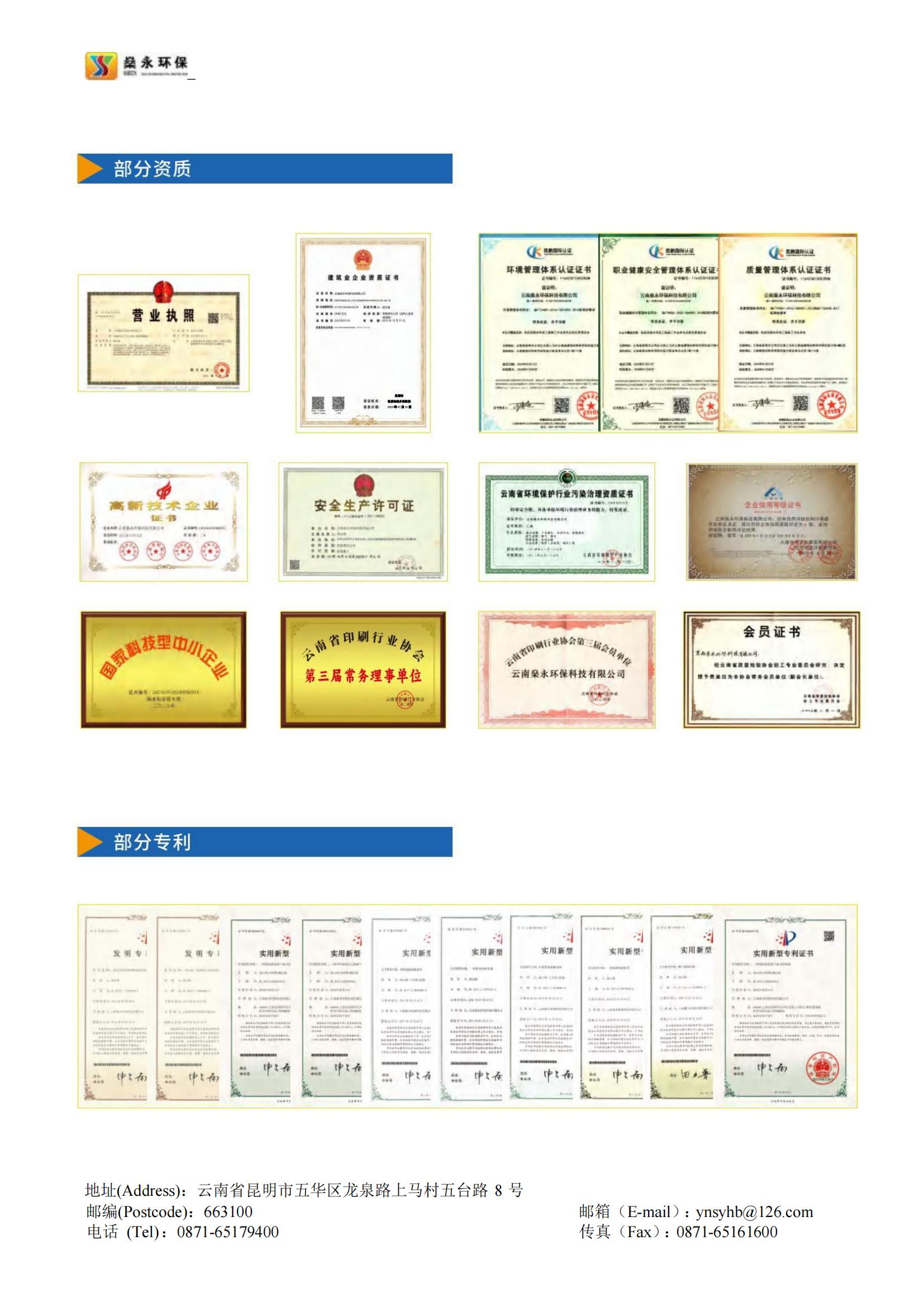燊永公司堅(jiān)持“創(chuàng)新、協(xié)作、共贏”的價(jià)值觀,以“專業(yè)、專心、專注”為服務(wù)理念,以“求實(shí)、求是、求精”為質(zhì)量宗旨,為客戶提供優(yōu)質(zhì)、高效、貼心的服務(wù)。公司獲得國家專業(yè)部門頒發(fā)的《環(huán)境工程專業(yè)承包三級》資質(zhì)、《污染治理乙級》資質(zhì)、《企業(yè)信用等級A級》證書、《云南省科技型中小企業(yè)》認(rèn)定證書、《ISO9001/GBT50430質(zhì)量管理體系》證書、《ISO14001環(huán)境管理體系》證書、《ISO45001職業(yè)健康安全管理體系》證書等多項(xiàng)榮譽(yù)和多項(xiàng)的專利技術(shù)。